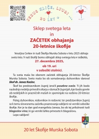 Vesoljna Cerkev in tudi Škofija Murska Sobota v letu 2025 obhaja sveto leto. V naši škofiji bomo obhajali sklep svetega leta v soboto, 27. decembra 2025, ob 19. uri v soboški stolnici. Ta sveta maša bo obenem začetek obhajanja 20-letnice Škofije Murska Sobota. Sveto mašo bo ob somaševanju duhovnikov daroval škof dr. Janez Kozinc. Škof bo predstavnikom župnij izročil posebne sveče. Ti jih bodo naslednjo nedeljo prinesli k oltarju v domačih župnijah, kjer bodo gorele ob nedeljskih in prazničnih mašah in spominjale na vsebino 20-letnice škofije. Poleg duhovnikov, redovnikov in redovnic ter predstavnikov župnij so k temu slovesnemu začetku praznovanja vabljeni vsi verniki soboške škofije.