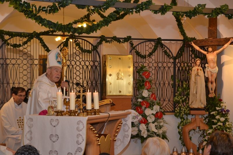 Slovesno sv. mašo ob 17. uri je vodil murskosoboški škof msgr. dr. Peter Štumpf. "Cerkev svetnikov, ki so v nebesih, je poveličana Cerkev, ki živi v polnosti gledanja in obhajanja bogoslužja pred obličjem živega in vsemogočnega Boga," je v pridigi poudaril škof ordinarij. Spomnil je na kip fatimske Matere Božje, ki smo ga v teh dneh sprejeli v Slovenijo. "To je milost. Nebesa se ponovno milostno sklanjajo k Sloveniji." Tako bodo na predvečer dneva državnosti slovenski škofje v ljubljanski stolnici slovenski narod posvetili Srcu Jezusovemu in Srcu Marijinemu, je povedal g. škof in naznanil, da bo milostni kip fatimske Matere Božje prišel tudi v našo murskosoboško škofijo in sicer 9. septembra. Navzoče je g. škof povabil na sprejem, ki bo v stolnici ob 21. uri, ko bomo obnovili našo posvetitev Svetima Srcema. Ta milostni kip Matere Božje bo romal po župnijah naše škofije do 18. septembra. Fatimska Božja Mati bo obiskala tudi samostan klaris v Turnišču, ki je posvečen prav Njej, ki je Mati Cerkve, je povedal g. škof. "Mati Marija je postala Mati Cerkve v binkoštni dvorani, ko je skupaj z apostoli molila. ... Vsaka molitev Cerkev oživlja in poživlja v Svetem Duhu, da raste v svetosti." Škof je v nadaljevanju pokazal na zgled opatinje matere s. M. Katarine, kot ženo Ognja, ki Cerkev na Slovenskem osvetljuje z močno Lučjo," in ji v imenu soboške škofije voščil ob 70. letnici življenja ter ji podaril spominsko svečo in kipec zavetnika soboške škofije sv. Metoda. "V tej kapeli in v tem samostanu je vse drugače, kot je tam zunaj. Tukaj diši po nebesih," je poudaril g. škof in se zahvalil za molitev sester klaris in njihovo navzočnost v naši škofiji. Po sklepnem blagoslovu se je opatinja s. M. Katarina g. škofu zahvalila za izrečene besede in vse navzoče povabila k molitvi v kapelo samostana in dejala, da to ni samo kapela sester klaris temveč vseh, saj nas tam vedno čakata Jezus in Marija.