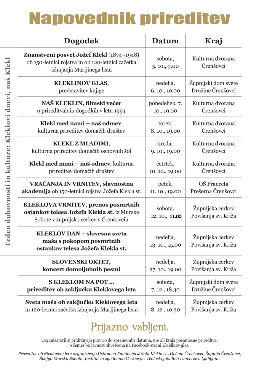 V nedeljo, 13. oktobra, na dan rojstva Jožefa Klekla st. bo ob 15. uri slovesna sv. maša, ki jo bo daroval škof dr. Peter Štumpf ob somaševanju škofijskih duhovnikov. Pri sv. maši bo prepeval združeni pevski zbor, v katerem bodo za to priložnost sodelovali pevci iz župnijskih zborov celotne škofije. Sodeloval bo tudi orkester. Po končani sv. maši sledi pogrebni obred, ko bo telo Jožefa Klekla pokopano v novi grob – v fatimski kapeli župnijske cerkve v Črensovcih.