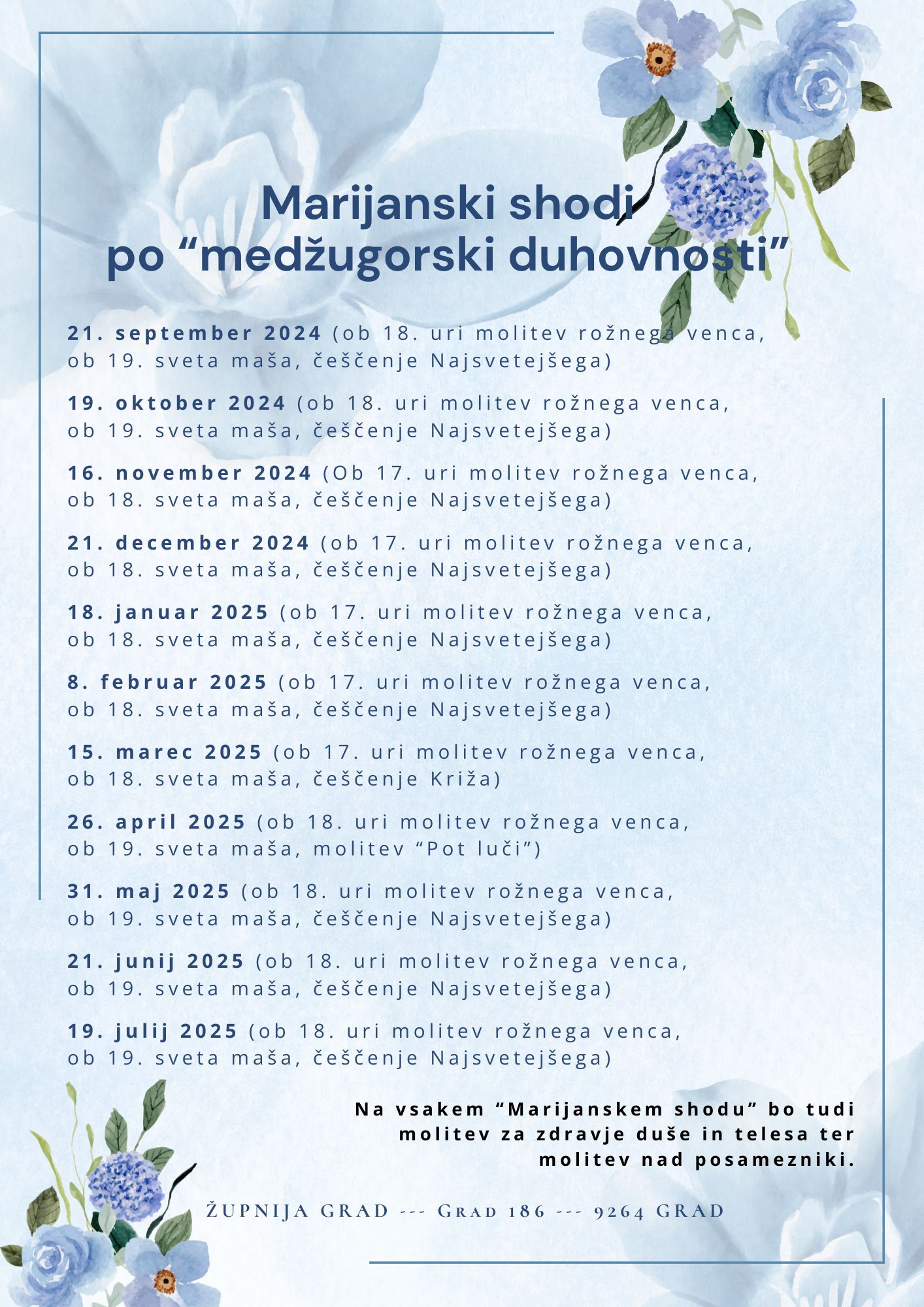 19. julij 2025 (ob 18. uri molitev rožnega venca, ob 19. sveta maša, molitveni program)