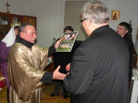 Koledniki so g. škofu prinesli tudi fotografijo s poletnega prijateljskega srečanja in nogometne tekme med ekipo Buzeti iz Bakovec in ekipo mlajših duhovnikov. G škof pa jim je v zahvalo podaril majico ?papeške nogometne ekipe? iz Buenos Airesa.