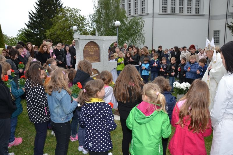 Ob koncu slovesnosti je škof blagoslovil spominsko ploščo s kronogramom, ki ga je sestavil za to priložnost. Latinski napis pomeni: ?Tu počiva Lojze Kozar / Božji služabnik / Iz življenja zemeljskega / je tretjega dne majskih kalend / stopil gor nad nas. / Leto se iz črk prebere.? Člana Kozarjevega odbora sta potem ploščo odnesla na grob Božjega služabnika, kjer bo dopolnjevala spominski napis. Otroci 1. in 2. razreda so ob grob postavili sedemnajst sveč in rože, vsi zbrani pa so ob grobu zapeli pesem V nebesih sem doma. Slovesnost je izzvenela v zahvalo Bogu za zgled Božjega služabnika Alojzija Kozarja in kot prošnja, da bi dosegel čast oltarja.