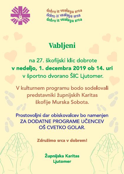 Vabljeni na 27. škofijski Klic dobrote, ki bo v nedeljo, 1. decembra 2019, ob 14. uri v športni dvorani ŠIC v Ljutomeru. V kulturnem programu, ki bo potekal pod geslom Dobro iz vsakega srca, bodo sodelovali predstavniki Župnijskih karitas Škofije Murska Sobota. Prostovoljni dar obiskovalcev bo namenjen dodatnim programom za učence OŠ Cvetko Golar.