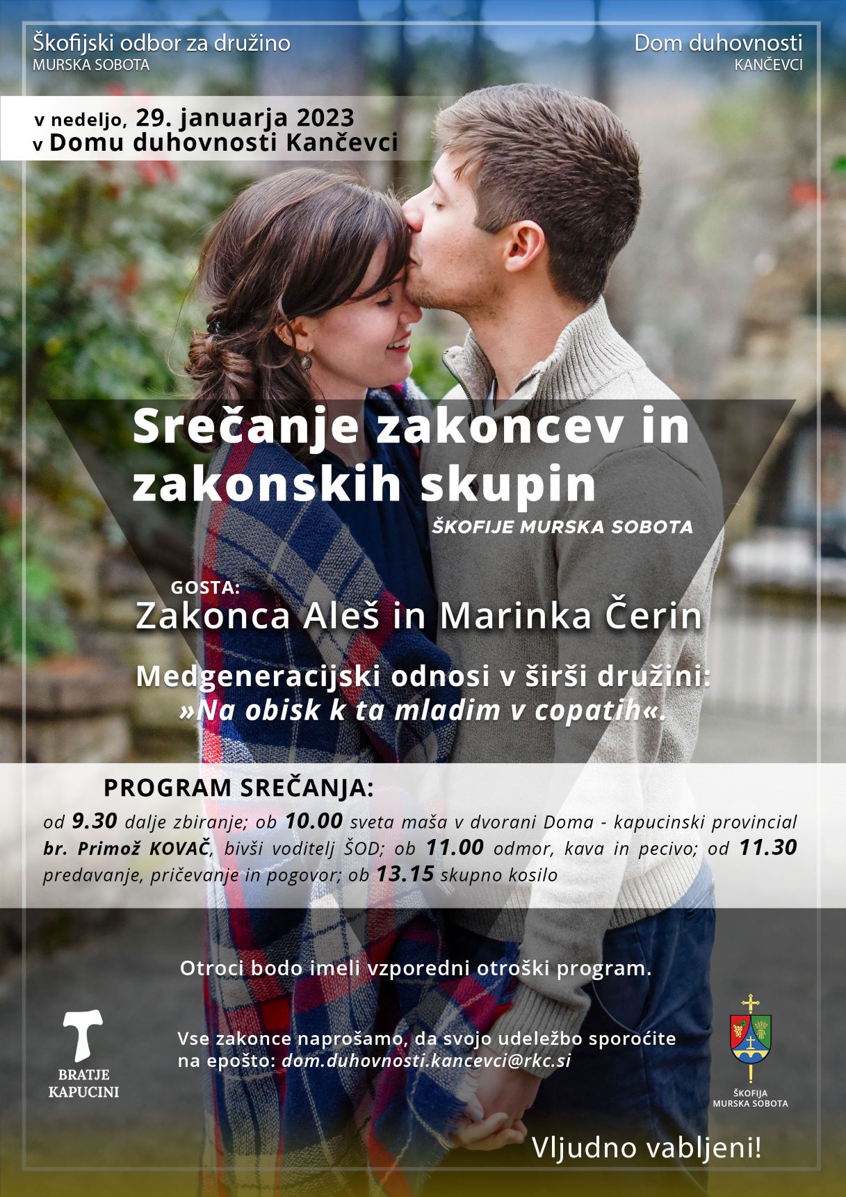 Škofijsko srečanje zakoncev in zakonskih skupin bo v nedeljo, 29. januarja 2023, od 9.30 do 14.00, v Domu duhovnosti v Kančevcih. Na srečanje posebej vabljeni zakonci, družine in zakonske skupine.