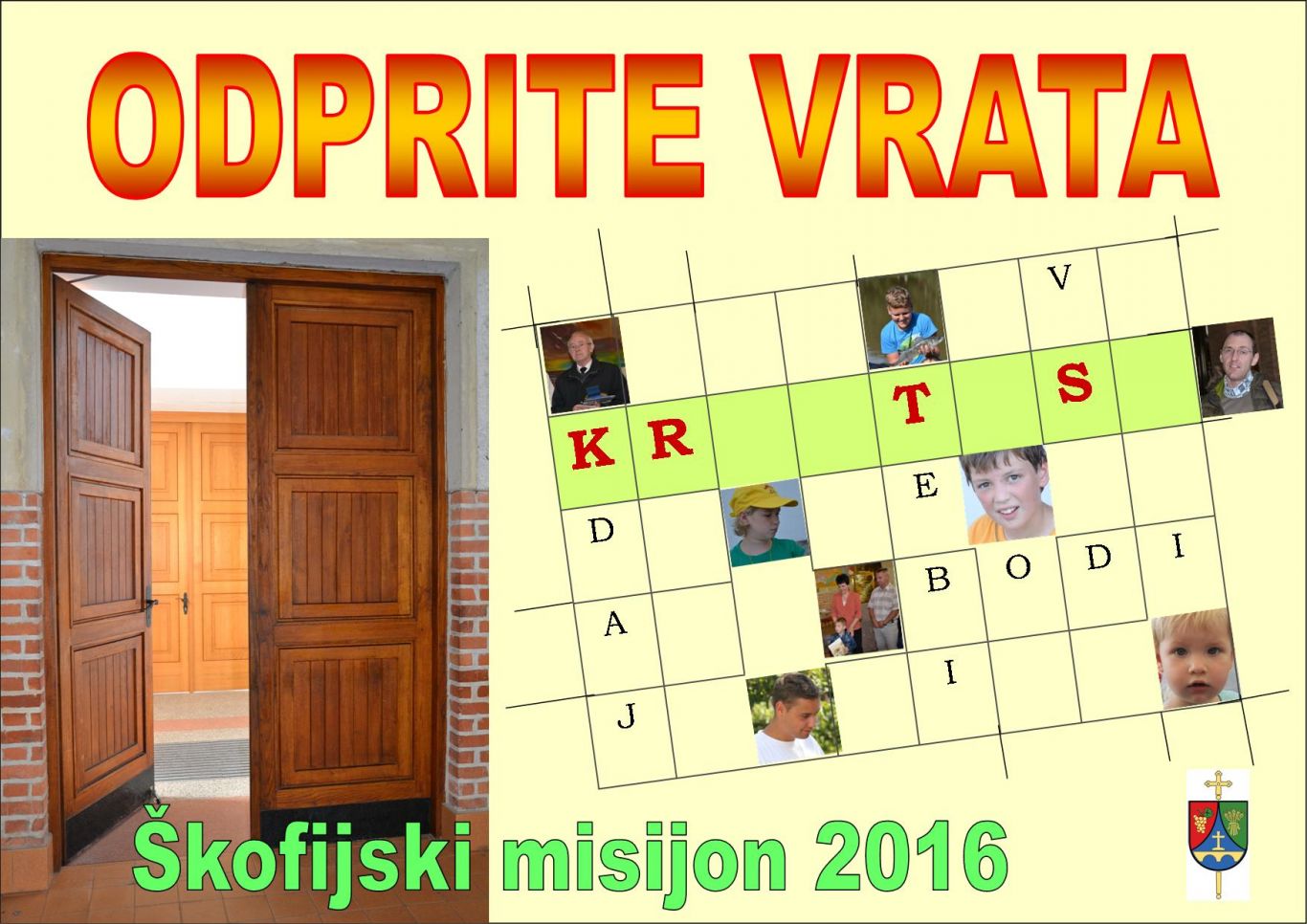 Vidimo velik napis: Odprite vrata. Na fotografiji so vrata, pravzaprav dvojna, ena so delno odprta, druga zaprta. Če hočemo kam vstopiti, ali če hočemo, da kdo vstopi k nam, moramo vrata odpreti. Za koga naj mi, predvsem v času priprave in v času poteka škofijskega misijona, odpiramo vrata? Odgovor najdemo v rešitvi križanke, ki jo vidimo na plakatu. Že sama križanka nas vabi k razmišljanju. Odpreti vrata nekomu je lahko tvegano dejanje. Potrebno je premisliti, ali je tista oseba vredna našega zaupanja, je vsebina vredna, da postane domača v naši hiši, v mojem srcu. V naše domove, v naša srca vstopa marsikaj, dobro in slabo. Ni dobro kar tako vse povprek sprejemati. Komu torej naj odpremo vrata? Na rumenem polju križanke so zapisane črke K R T S z vmesnimi presledki. Če nekoliko razmislimo, spoznamo, da manjkajo črke: I S U U. Ko jih vpišemo, dobimo besedo: Kristusu. Torej nas plakat vabi, da odpremo vrata Kristusu. Zakaj njemu? Ker je Bog, ker je naš Odrešenik, ker nas ima rad in nam želi samo dobro. Zakaj naj Kristusu odpiramo vrata?