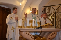 Samostan klaris v Turnišču živi. Je kraj srečevanja z Jezusom. To misel je v začetku svete maše poudarila opatinja s. Katarina, ko je pozdravila škofa dr. Petra Štumpfa, škofa dr. Jožefa Smeja, petnajst duhovnikov, diakona in vse zbrane vernike. To misel je v pridigi poudaril in poglobil škof dr. Peter Štumpf. Najprej je spregovoril o apostolu Petru, ki ga Jezus ni spraševal nič drugega, le to, če ga ima rad bolj kot drugi. Tako Jezus sprašuje tudi nas. S tega kraja molitve in srečevanja z Jezusom moramo odhajati drugačni, spremenjeni, boljši, drugače prihajamo zaman. Škof dr. Peter Štumpf, ki je v začetku svete maše blagoslovil nove klopi v samostanski kapeli, je po pridigi povabil diakona Borisa Kučka k izpovedi vere. Tako je dan pred duhovniškim posvečenjem v samostanski kapeli Marije, Matere Cerkve izpovedal vero in podpisal prisego o duhovniških obljubah. Ob koncu svete maše je zbrane nagovoril tudi škof dr. Jožef Smej. Poudaril je pomen duhovnega branja, premišljevalne molitve, skratka srečevanja z Bogom. Vprašal se je, ali naj duhovnik zaradi obilice dela opusti kakšno molitev. Poudaril je, da to nikakor ne bi bilo prav, saj Jezus pravi: Brez mene ne morete ničesar storiti. Delo, ki ni podprto z molitvijo, tako ali tako nima uspeha. Škof Smej je še v imenu vseh zbranih izrekel čestitke škofu dr. Petru Štumpfu ob rojstnem dnevu in godu.
