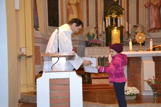 Beseda darovanje je zaznamovala Halasov molitveni shod v Veliki Polani. Začel se je z molitvijo pred Najsvetejšim, ko so učenci 1. in 2. razreda ter predstavniki drugih razredov iz Župnije Odranci prinašali risbe, ki so jih prejšnji teden narisali pri verouku in doma. Predstavili so življenje in delo Božjega služabnika Danijela Halasa, vsi navzoči pa so z molitvijo izrekli zahvalo zanj. Sledila je sveta maša, ki jo je ob domačem župniku Borisu Tibautu in hotiškem župniku Viljemu Kovaču daroval odranski župnik Lojze Kozar. S petjem so sodelovali pevci Kozarjevega zbora in zbora Neuničljivo upanje, z branjem pa starši otrok 1. in 2. razreda. Pri pridigi so učenci prinesli osem slik in ob njih smo razmišljali o pomenu darovanja in o ljudeh, ki so se darovali. Spomnili smo se na Boga, ki nam daje stvarstvo in mnoge druge dobrine, na Jezusa, ki je daroval sam sebe, na Marijo, ki se je darovala za Jezusa, zdaj pa prosi za nas. Za vernike v Veliki Polani in tudi za nas se je daroval Božji služabnik Danijel Halas, dal je vse, celo svoje življenje. Daroval se je tudi njegov naslednik v Veliki Polani, kasnejši odranski župnik Božji služabnik Alojzij Kozar. Zdaj smo na vrsti mi, da se darujemo za svoje bližnje in za Boga. Na vse to so nas spomnile risbe, nato pa še pesem, ki smo jo zapeli po napevu pesmi Kraljica venca rožnega.