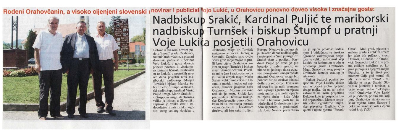 Na pobudo in v spremstvu gospoda Voja Lukiča, novinarja, publicista in televizijskega dokumentarista, laureata Slovenske akademije znanosti in umetnosti, sta mariborski nadškof in metropolit msgr. dr. Marjan Turnšek in murskosoboški škof msgr. dr. Peter Štumpf v torek, 23. avgusta 2011, obiskala Orahovico in Đakovo v Slavoniji. V Orahovici sta si ogledala naravne lepote mesta, obiskala sakralne objekte in na grobu na mestnem pokopališču molila za pokojno mamo gospoda Lukiča, gospo Đurđico Lukić.